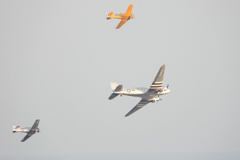 They were a C-47B DC-3 Dakota (the largest in the images), an emblematic plane of the landings, and two T-6G Texans, used during World War II.